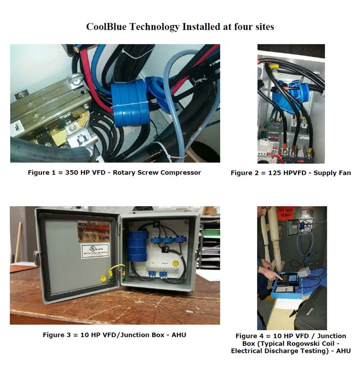 The sixth solution = (on many VFD in Vancouver, Canada) at several facilities has proven smart and very effective where EIBD would have otherwise developed within one year or less. CoolBlue™ products have been installed inside VFD cabinets from 5 HP to 350 HP with excellent results. CoolBlue™ Inductive Absorbers are installed around the three phase wires inside the VFD compartment or a CSA enclosure nearby. The CoolBlue™ technology reduces (harmful) electrical discharge levels (pulses) that travel through the wires to the motor so they don't reach the motors. Note: Electrical discharge levels is the actual main source of shaft current buildup in VFD motors. Rogowski Coil tests (see photos and graphs here) are used before and after installation to confirm electrical discharge levels have been reduced below harmful levels. See the CoolBlue™ section of this page for more information. Also you can review a major CoolBlue™ case study at a Geo Thermal Pump Station here.